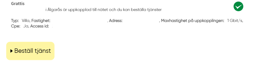 Om du är ansluten kommer det se ut något liknande nedan, några saker är borttagna då det kommer stå eran info. Om det står grattis här så kan du klicka på Beställ tjänst, så klicka på den gula knappen ”beställ tjänst”.
